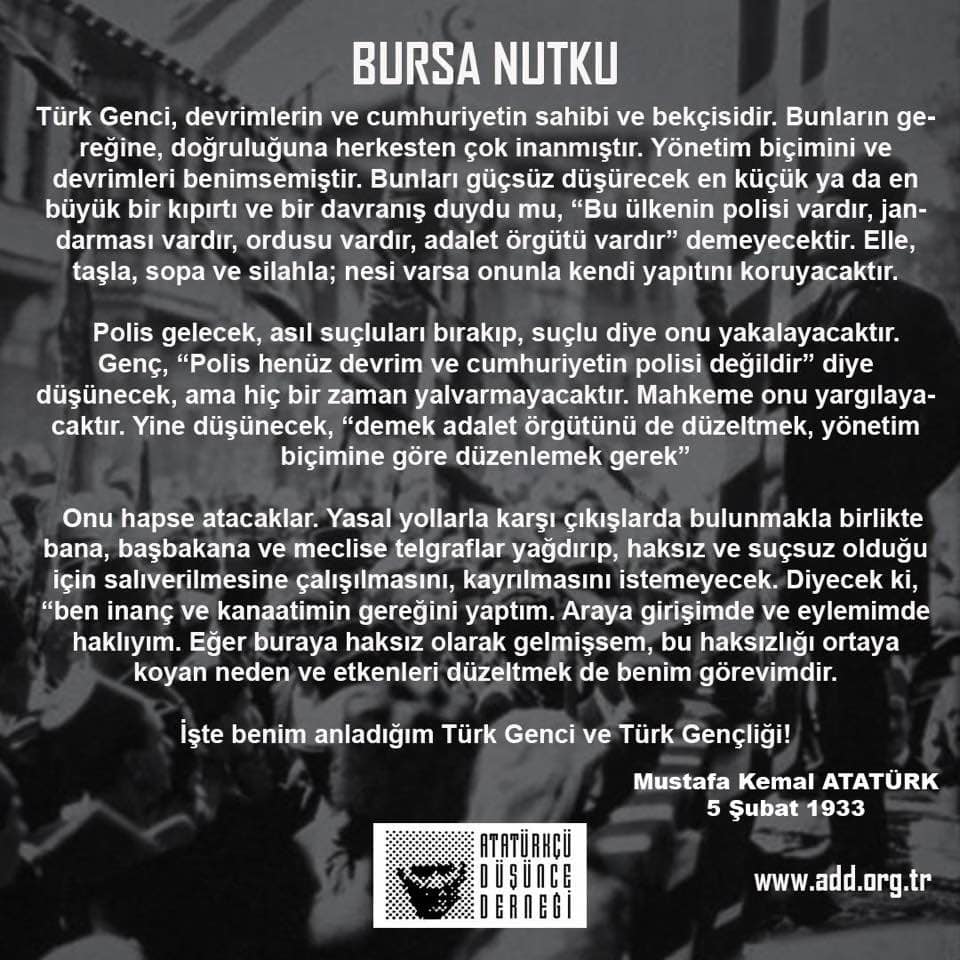 Atamızın Bursa Nutku'nun yıldönümü 6 Şubat 2019 da da ADD Bursa Şb.mizin öncülüğünde bir kez daha Bursa da okundu. Destek olan tüm ADD Şubelerine STK ve Siyasi Partilere Teşekkür ederiz.